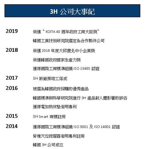 為了人類健康快樂,3H研發獨特的垂直按摩裝置,早在2010年7月向韓國知識產權管理局申請專利,2012年4月獲得批准(註冊專利10-1136724),歷時1年半。按摩床的電熱床墊則在2016年2月獲得專利(註冊專利10-1614327)。